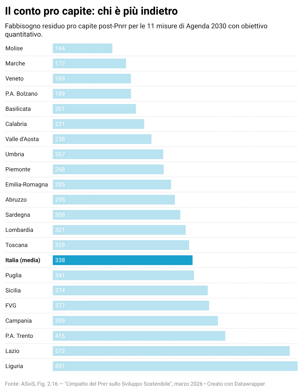 Il rapporto fotografa dati profondamente differenti, regione per regione, e anche al loro interno. In Italia l’impatto del Pnrr non è stato uniforme, inserendosi in ritardi e disuguaglianze pregresse. Allo stesso modo, anche i 20 miliardi ancora necessari non si distribuiscono in modo omogenea. Il rapporto Asvis produce per ogni regione una stima della distanza residua dagli obiettivi, misura per misura. Le regioni che hanno beneficiato di più del Pnrr – nel rapporto tra contributo del Piano e distanza residua – sono Abruzzo, Molise, Calabria, Marche, Piemonte e Veneto. Le situazioni più critiche sono quelle della Liguria, del Lazio e della Campania, con un gap rispetto agli obiettivi dell’Agenda 2030 superiore al 50%.