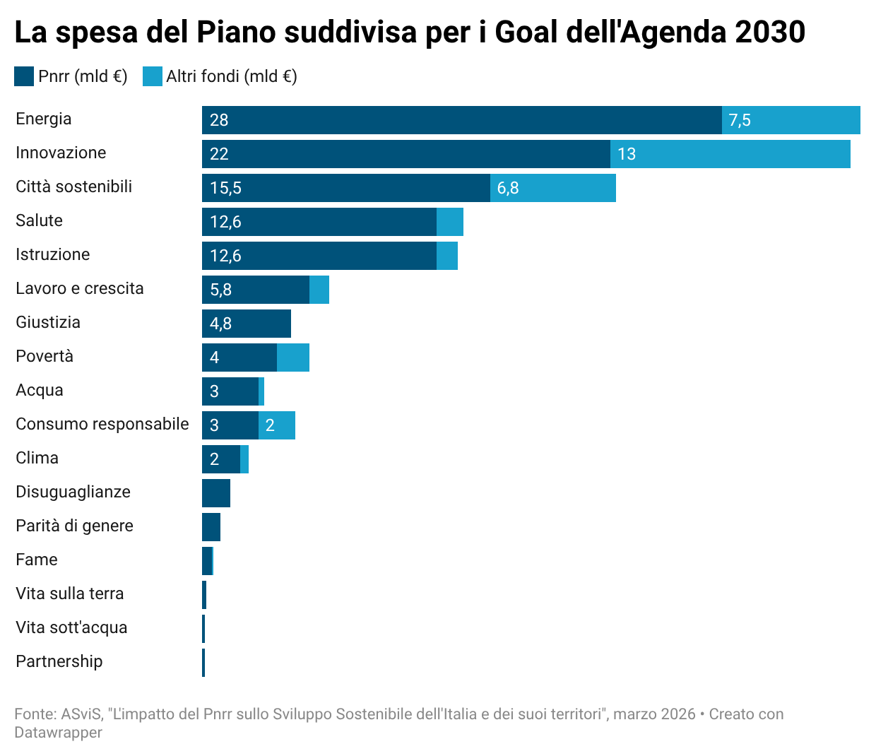 La ripartizione degli investimenti tra i 17 Obiettivi di sviluppo sostenibili (Sdg) consente di leggere le scelte politiche sottostanti al Piano. La quota più rilevante è andata all’energia, con il 25% delle risorse (quasi 28 miliardi). Seguono innovazione, infrastrutture e sistema produttivo con il 20%, pari a 22 miliardi, e città sostenibili con il 14%, circa 15,5 miliardi. Salute e istruzione assorbono ciascuno circa l’11%.